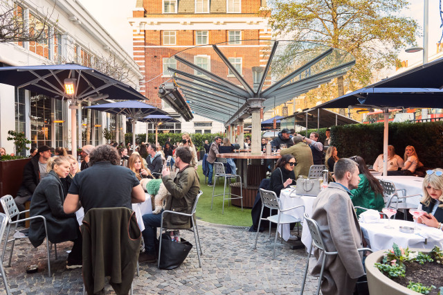 The décor is industrial chic, New York loft meets refined elegance. Floral displays and trees scattered throughout the restaurant create a sense of calm and bring a bit of the outdoors in, while soaring rust-coloured steel rafters and large leaded glass picture windows looking down onto the action of the Kings Road below create a striking focal point.