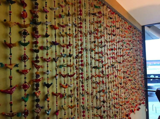 Arriving with great anticipation, we were welcomed by the impressive interiors, bathed in deep red tones and dark wood features. The floor to ceiling windows blend the sights of the riverside with authentic Indian texture and colours. We began our evening by enjoying the more relaxed atmosphere of the downstairs lounge, featuring crescent shaped sofas, brightly coloured wall paintings and glass cases boasting a variety of traditional jewellery for sale. We ascended the staircase leading up to the restaurant, greeted by a wall of multicoloured hanging tota, and were seated at a table overlooking the River Thames. Discovering treasures around every corner, even our table doubled as a display full of beads, bangles and mysterious looking leather bound notebooks. From the art on the walls and decorative sculptures, each intricate detail adds to the unique atmosphere of Chokhi Dhani. “The jewellery has been sourced from all corners of Rajasthan to showcase the talent of the local handicraft people in the region”, says Dan Jelensek, General manager.