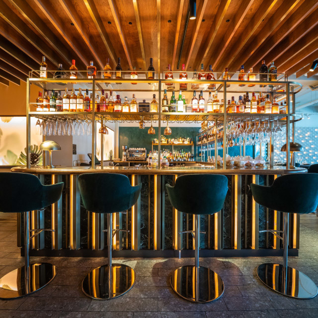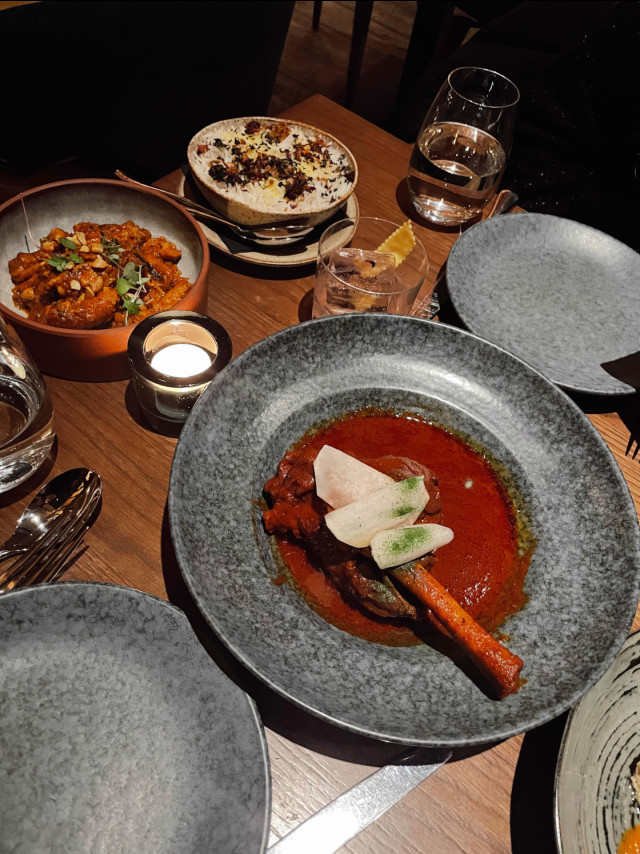 On entering the restaurant, the first thing that catches your eye is the beauty of the place itself. Solid gold ornaments hanging throughout the restaurant create an elegant and cosy atmosphere. You can immediately feel the vibe, air buzzes with chatter, the main large bar in the middle invites you to try the wide range of cocktails. The open kitchen at the back gives off delicious smells, making you want to sit and devour the entire menu.