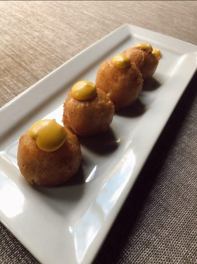 We kicked off our lunch with a gorgeous complementary plate. We were treated with a selection of four homemade “Buñuelos de Bacalao” (Cod fritters with roasted garlic ali-oli). We have to admit that our hearts were full since the very first bite. Succulent, creamy and crunchy cod fritters full of flavour. Truly recommend them.