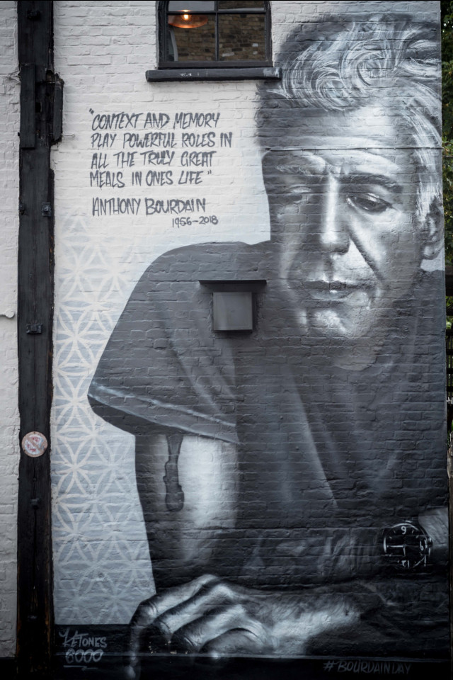 Chef Peter Lloyd, owner of restaurant Sticky Mango, is one of many who were inspired by Anthony’s journeys, and in honour of the great chef, Peter commissioned a stunning mural, which was created by street artist Jerome Davenport and is displayed on the front of Peter’s south London restaurant. From one Chef to another, this awesome work of art is Peter’s way of paying his respects for all the great memories the two shared on screen, through the pages of Kitchen Confidential, together on a chef tour and again at the World Street Food Congress in Singapore and Manila.